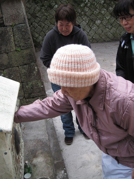 職員に手を引かれながら、お賽銭とお賽米を手にして、参拝にいきま~す。