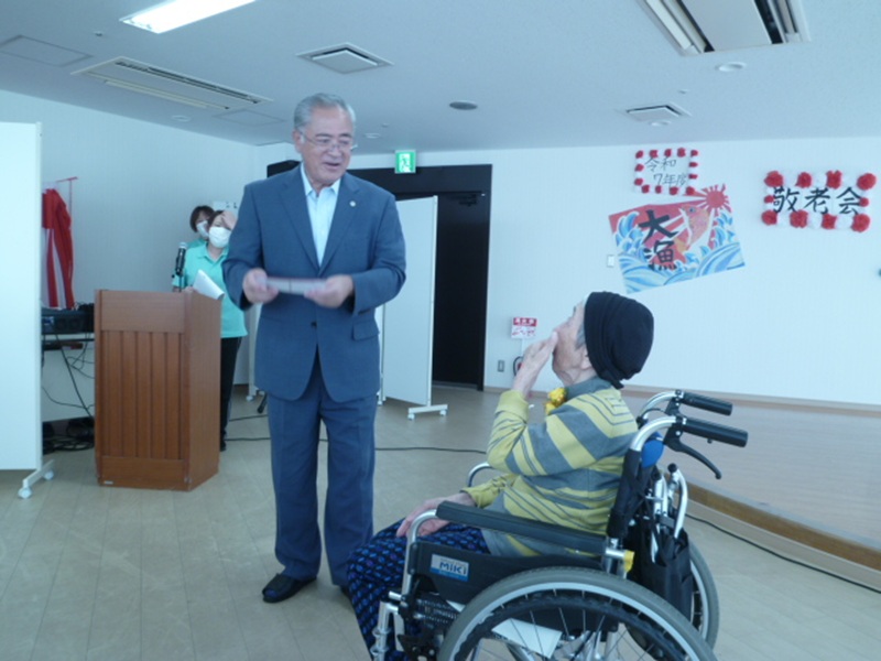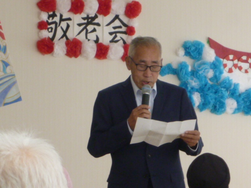 最初は理事長のあいさつ。みなさんの敬老をお祝いするお言葉ありがとうございました。