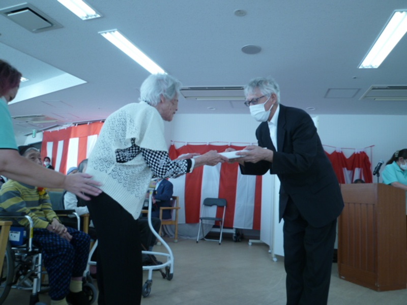 90歳以上の入所者、ご利用者の紹介。村長から神津島村より長寿のお祝いとして90歳以上の入居様にお祝いが手渡されました。